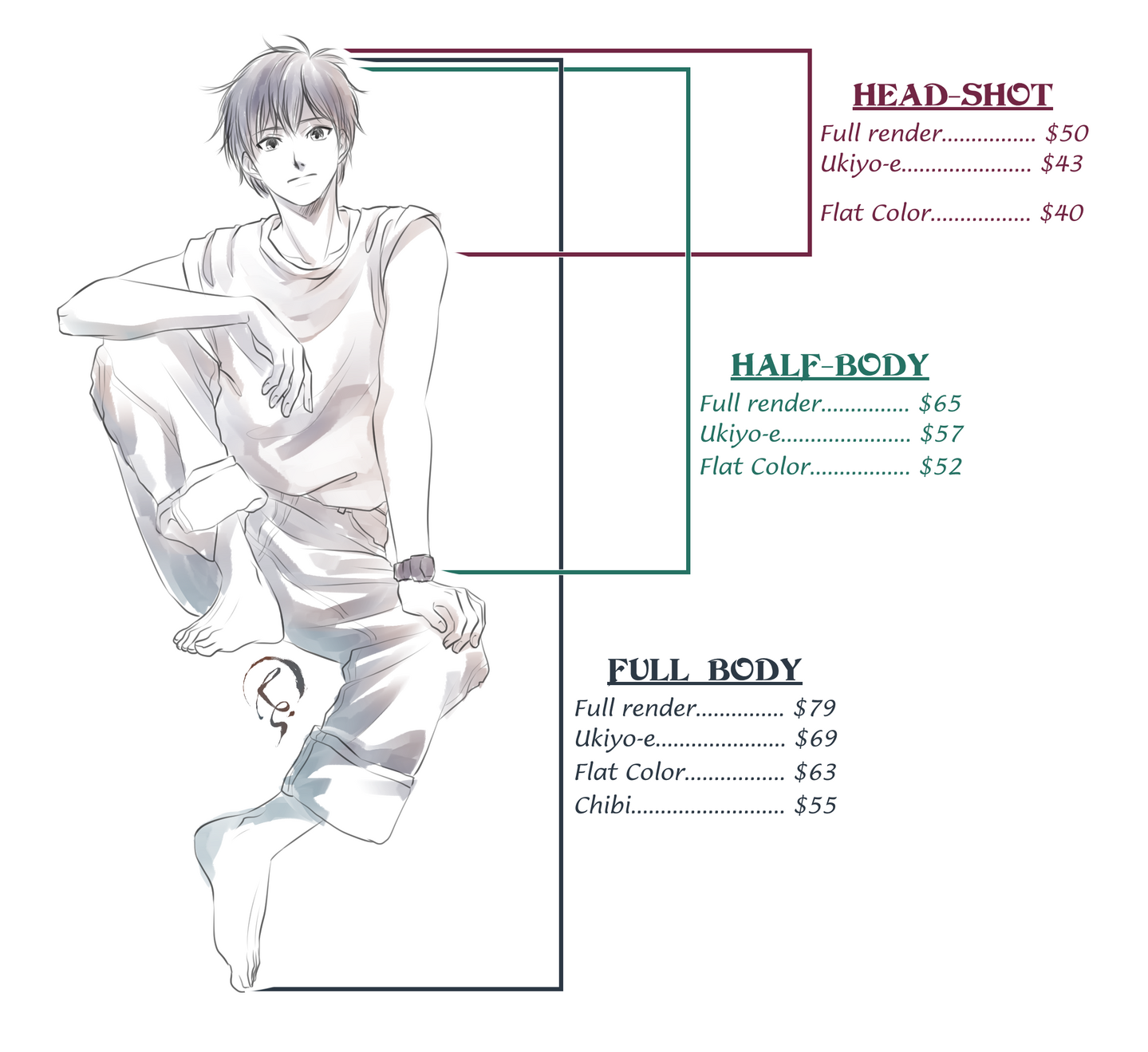 As you may know, I draw characters with anime/manga-ish style, with various coloring as seen in Sample Gallery. All prices on the list are base price, therefore I might possibly give additional cost if you want to add more items and/or details, depending on the complexity.